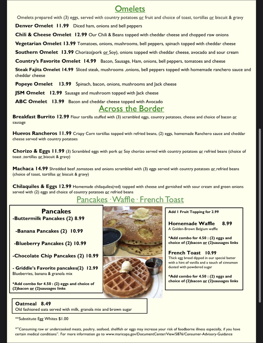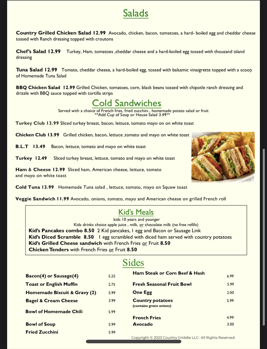 From a reviewer’s perspective, the menu at Country Griddle delivers a well-rounded and comforting dining experience that clearly reflects its focus on hearty American breakfast and classic diner-style favorites. What stands out most is the impressive variety, allowing guests to enjoy familiar flavors while still having plenty of options to explore. The Classic Breakfasts such as Eggs Any Style, Bacon & Eggs, Sausage & Eggs, Turkey Sausage & Eggs, and Cornbeef Hash & Eggs set a solid foundation for the menu, appealing to anyone who enjoys a traditional, satisfying start to the day.