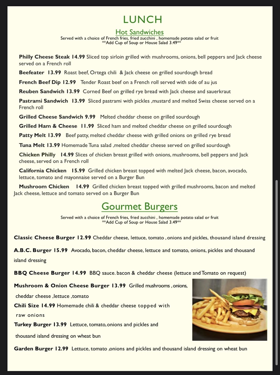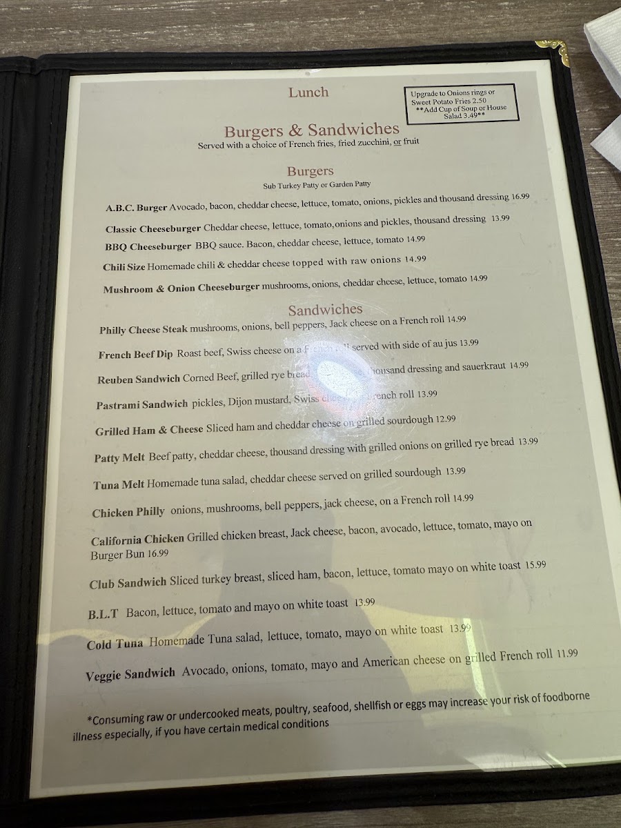 Sweet breakfast lovers are not forgotten, thanks to Buttermilk Pancakes (2), Banana Pancakes (2), Blueberry Pancakes (2), Chocolate Chip Pancakes (2), and Griddle's Favorite Pancakes (2). Beyond breakfast, the restaurant also offers satisfying lunch options, from Philly Cheese Steak, French Beef Dip, and Rueben Sandwich to lighter choices like Club Sandwich, B.L.T, and Veggie Sandwich. Gourmet Burgers such as the Classic Cheese Burger, ABC Burger, BBQ Cheese Burger, Mushroom & Onion Cheese Burger, and Chili Size round out the savory offerings.