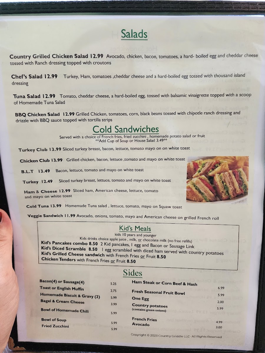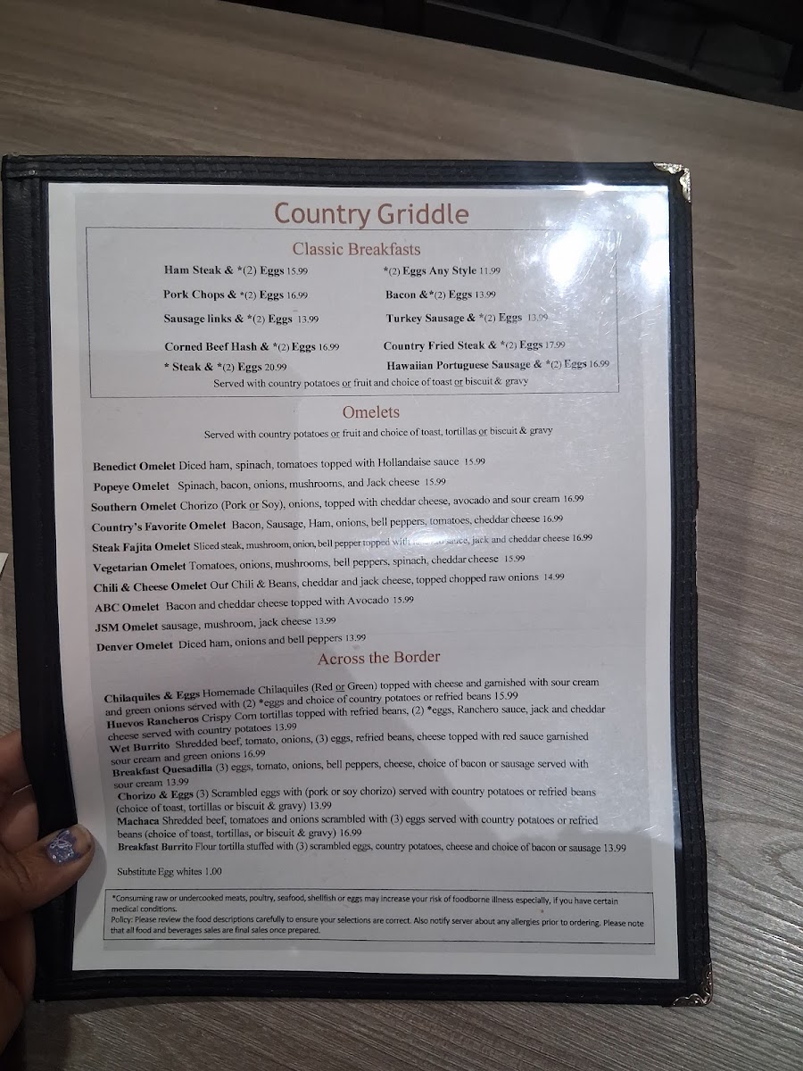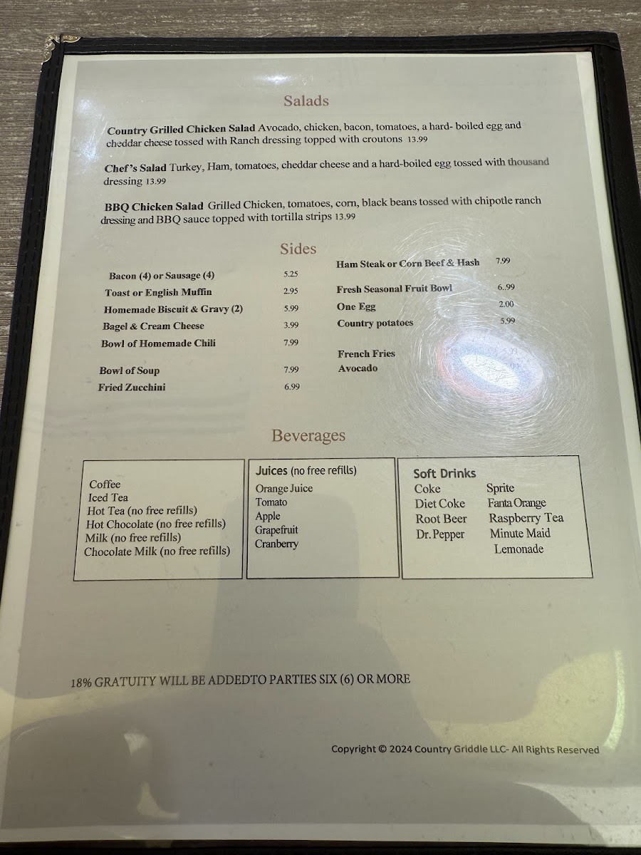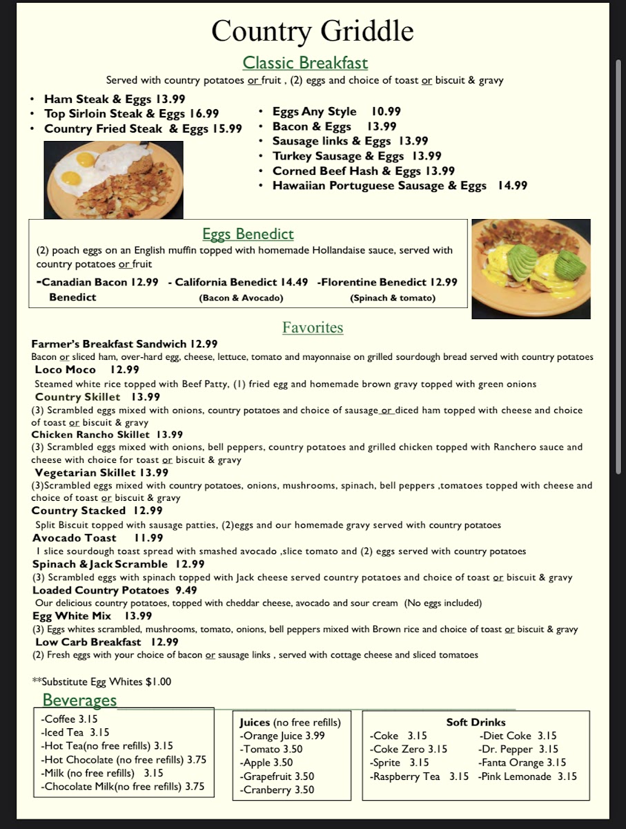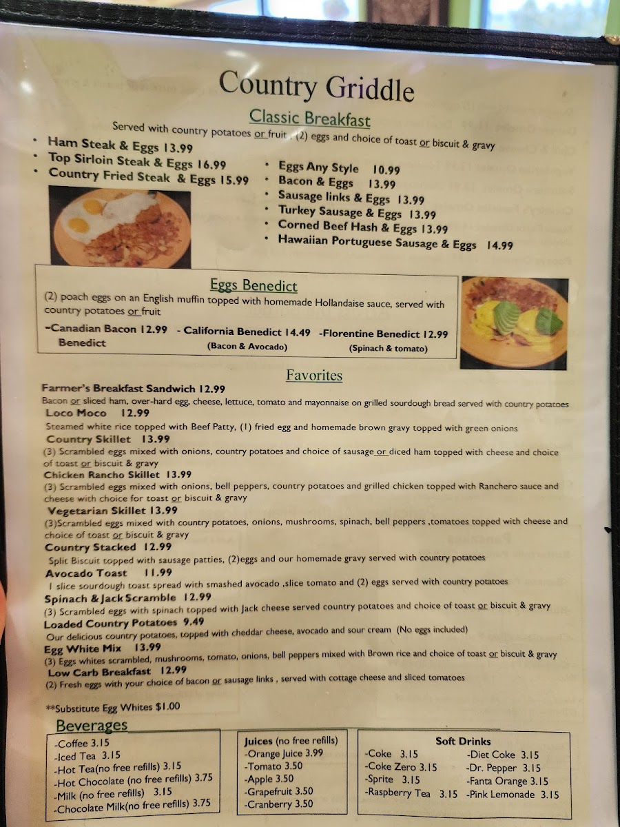 Finally, refreshing beverages-from Coffee and Orange Juice to Coke, Glass Mex. Coke, and Topo Chico-perfectly complement the meals. Overall, Country Griddle’s menu feels thoughtfully curated, generous in variety, and ideal for diners seeking both comfort and consistency in every visit.